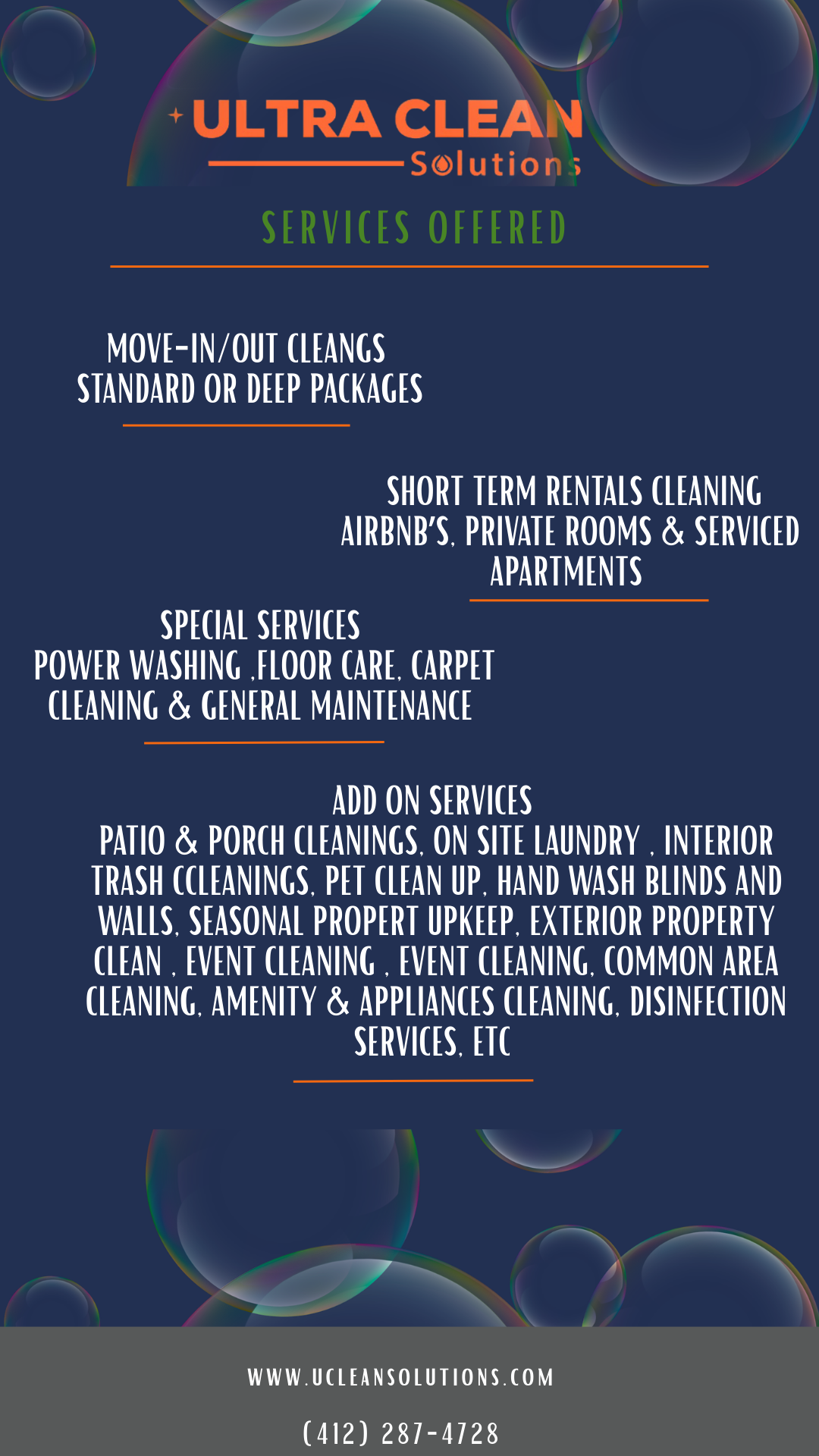 In addition to our Residential, Move- in/out, and Short Term Rental Cleanings services we offer a variety of other services including, Common Area Cleaning ( Lobbies, Hallways, Fitness Centers, etc.) Carpet Cleaning. Event Cleaning, Disinfect High Touch surfaces, Trash & Junk Removal, Power Washing (Buildings, Patios & walkways) Patio & Porch Clean up, Etc